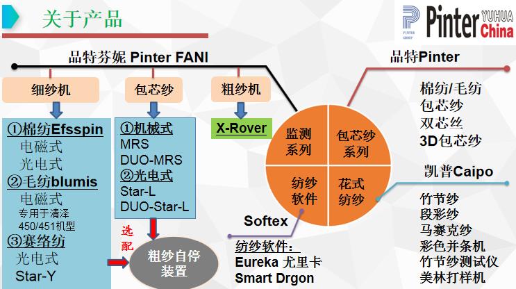 Pinter.FANI单锭监测系统,有光电式和电磁式两种,包括:BLUMIS毛纺单锭监测(专用于青泽450/451毛纺细纱机),Effispin棉纺单锭监测(电磁式和光电式2大类7个系列),Star-yarn赛络纺单锭监测,Star-L/Duo Star-L包芯纱芯丝监测,MRS/Duo MRS包芯纱芯丝监测,和 R-Stop 粗纱自停装置。